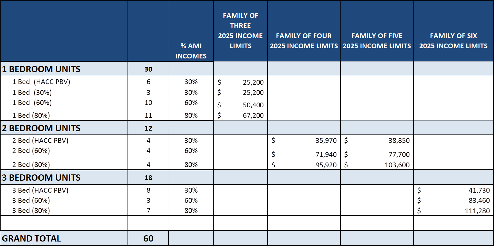 The South Boulevard Shores development includes a total of 60 units. As summarized in the table below, there is planned 30 one-bedroom units, 12 two-bedroom units, and 18 three-bedroom units. Each unit type is further summarized by income level limits. Twenty-one (21) units will be available to households earning 30% of Area Median Income, 17 units to household earning 60%, and 22 units for households earning 80%. The second table summarizes a sample of occupations earning the maximum income levels.